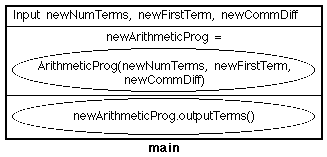 Table 7: Arithmetic progression application classes 6.4. Testing6.4.1. Black box testingArithmetic Testing: We should test inputs with negative, zero and positive sample values. A suitable set of test cases is given below. Note that a zero or negative input for "number of terms" will result in no output because the loop is never exercised. Note also that with this many test cases a test harness program seems like a good idea. Some suitable code is presented in Table 8.